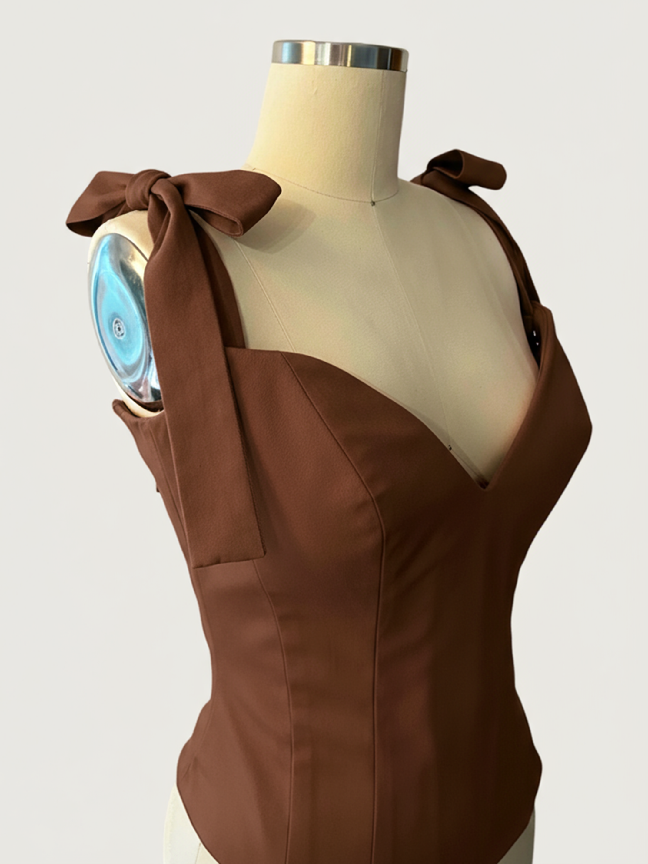 The idea for the Metamorphosis Corset came to me while researching sustainability practices and learning how true responsibility lies not just in materials, fabrication methods and longevity, but also in versatility. I always look to nature for inspiration and began thinking of the butterfly, how it changes form yet remains itself, and wondered if a garment could do the same. Something to evolve with a woman as she moves through the beautiful seasons of her life — from one celebration to the next, always becoming. This corset is that vision realized: a sculpted base with interchangeable sleeves and straps, meant to transform and endure.